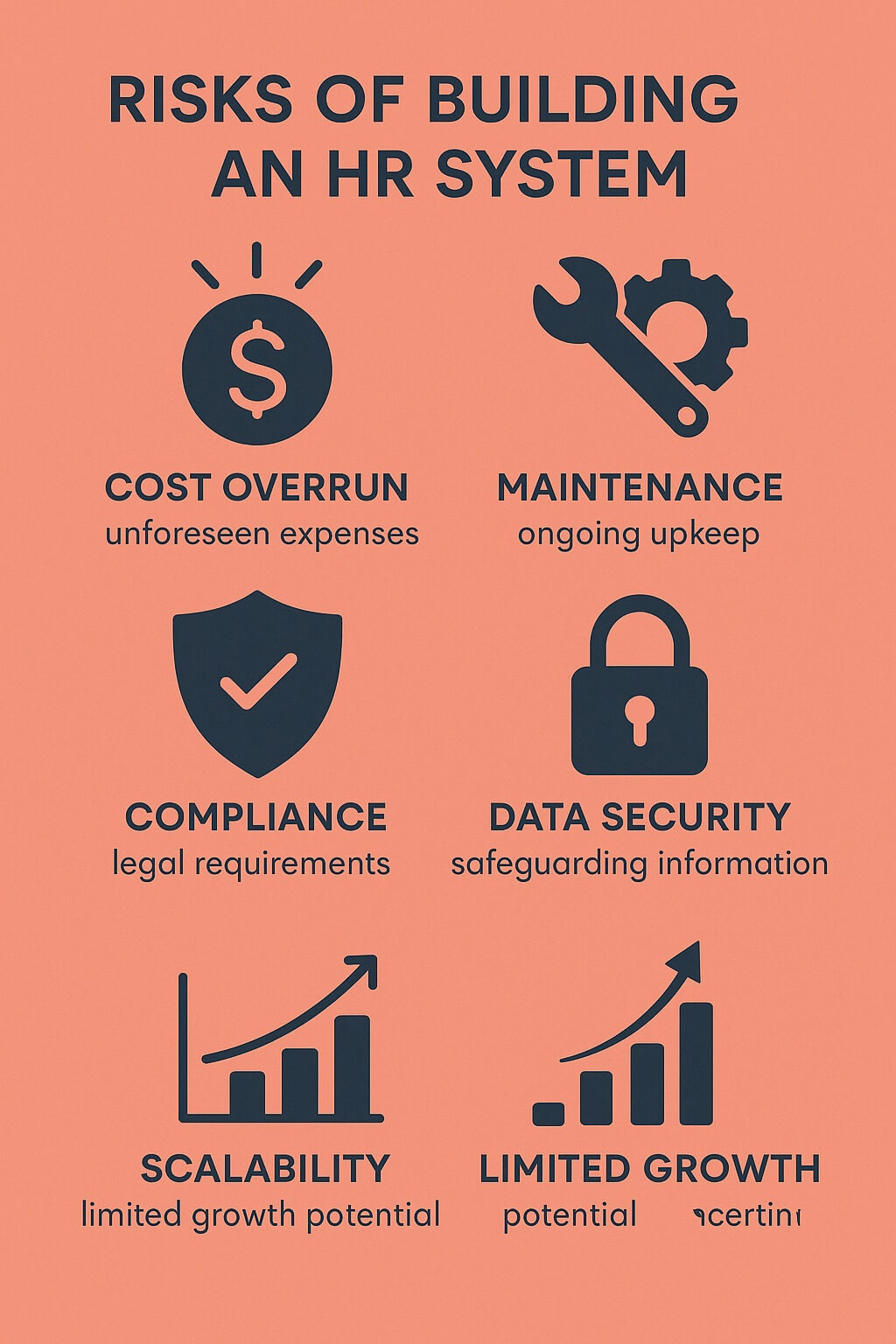 Custom HR system development carries significant risks that many small companies underestimate. The most obvious risk is cost overrun, as development projects frequently exceed initial estimates due to scope creep and unforeseen technical challenges.